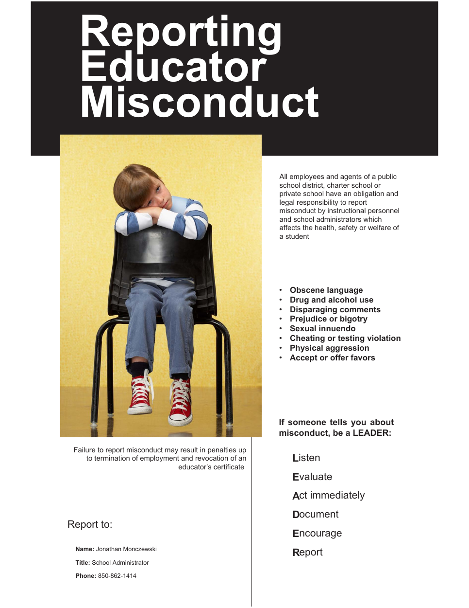 In accord with the Florida Ethics in Education Act, all employees of Calvary Christian Academy and Preschool have a duty to report all suspected or actual cases of child abuse, abandonment, or neglect; have immunity from liability if they report such cases in good faith and have a duty to comply with child protective investigations. There is a legal penalty for not reporting suspected or alleged child abuse or alleged misconduct by instructional personnel or school administrators. The Florida Abuse Hotline is 1-800-962-2873. The CCAP contact is Mr. Steve Thomas, Administrator, at 850-862-1414.